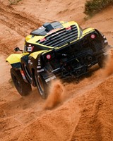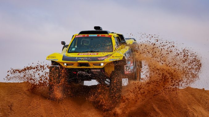 Puis, une fois la neutralisation respectée : « nous sommes arrivés sur une zone de dunes étalée sur une cinquantaine de kilomètres environ. Nous avons roulé de concert avec le Toyota T1+ de l’Argentin Alvarez. C’était sympa ce qui nous a permis d’augmenter le rythme et de comparer nos pointes de vitesse car, nous avons perdu cette année, 1mm de bride réduisant notre performance comparativement aux T1+, sans parler des leurs voies plus larges, des empattements en longueur, des débattements et des grosses roues de 32 à 37… De ce fait, la FIA en réunion hier, a décidé – à l’avenir- de lâcher un peu la bride des Buggys, cela nous défavorisa moins… »