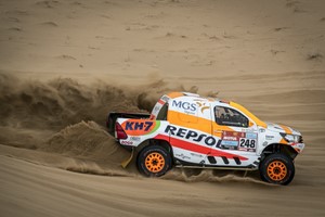 Pilote paraplégique, l’espagnol Isidre Esteve-Pujol ne cesse d’étonner chaque jour au volant de son Toyota Hilux Repsol. Après une semaine de course, l’équipage se dit satisfait de sa progression mais aussi, de bénéficier d’un éco-carburant qui les surprennent !