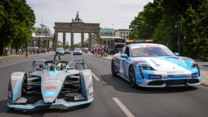 With the Taycan Turbo S as the safety car, Porsche is not only committed to Formula E safety. The distinctive design, which also attracts attention and curious glances on Berlin’s streets, flies the colours of all eleven teams and symbolises the commitment of everyone involved in Formula E and the joint commitment to the future of all-electric motor racing as well as social values such as diversity and community. The technology of Porsche’s first all-electric sports car is also impressive: Thanks to its driveability and safety as well as an output of up to 560 kW (761 PS) – the Porsche Taycan Turbo S is the ideal choice as a Formula E safety car. With launch control, the flagship model of the Taycan range accelerates from 0 to 100 km/h in 2.8 seconds and reaches a top speed of 260 km/h.