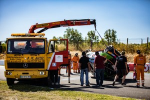 L’équipe technique effectue un constat pour savoir si, elle participera à la course 1 de cet après-midi après la remise en état qui s’impose.