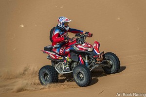 Pierre et Alex Combier – 7 & 8 : « Père et fils sont deux pilotes en quads et ils roulent évidemment ensemble. Hier ils n’ont fait qu’un tour mais n’ont pas boudé leur plaisir à rouler. Aujourd’hui au CP2 le moteur d’Alex a décidé de rendre l’âme. Il faut dire qu’il avait 8 ans et avait déjà quelques M’Hamis Express au compteur. Pierre est donc reparti avec deux motards pour finir seul, sans son père, cette étape. Pour son premier rallye raid et sa première venue au Maroc il a été littéralement émerveillé par les grandes dunes. J’étais triste de laisser papa au CP mais il fallait bien rouler. J’en ai pris plein les yeux, on a eu de très belles pistes, des dunes,, c’étaigt une très belle spéciale. J’avais la banane à l’arrivée. »