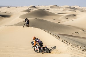 Non seulement les cadors se retrouvaient en difficulté dans cette SS1 mais une nouvelle étoile fila du fond de la grille, bouleversant la hiérarchie. Parti 29ème et inconnu au bataillon des Bajas, le jeune Autrichien, Tobias Ebster (Husqvarna) surgissait des lignes arrières pour remporter la première Spéciale vendredi. Samedi, parti le premier sur la piste, il se fit rapidement rattraper par Konrad Dabrowski puis resta prudemment dans la roue du jeune Polonais expérimenté jusqu’à l’arrivée, terminant troisième de la SS2 derrière Al Balooshi, plus chanceux dans la SS2 et Dabrowski. Au cumul des deux manches, Ebster remportait sa première Baja FIM devant Dabrowski et Rees Stravos !