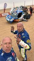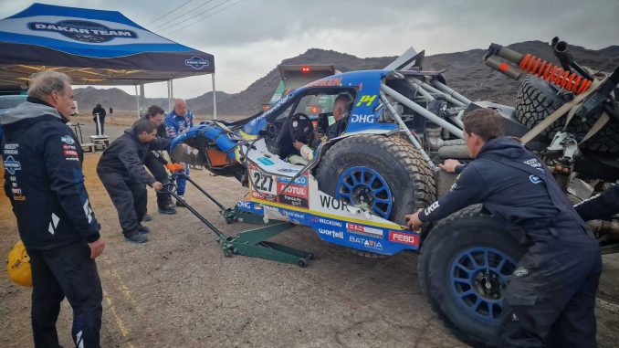 The Dakar is the Dakar: « unrelenting », Tim concluded. « It was just a small sand bump. We had a speed of about 160, 170 kilometres and were launched. » The damage to the car was significant. The various parts were scattered everywhere. The entire left front of the car had broken. After scraping everything together again, assessing the damage and recovering from the initial shock, they decided to see if and how they could reach the finish line. Repairing on site was impossible, the finish line not far away. They succeeded on three wheels and at the finish they were able to hook up with Pascal de Baar’s truck, who towed them to the service park, 94 kilometers away.