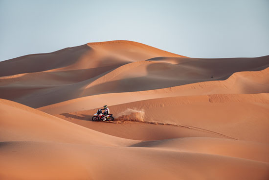 Franco Caimi: « I had some good fun on the bike today in the nice dunes of the Empty Quarter. A small mistake around 40 kms where I couldn’t find a waypoint cost me around 5 minutes. Anyhow, I could clear that in the end, and I’m happy to finish in the top-10 for the third consecutive stage – all thanks to the good rhythm I have achieved with my Hero 450! Looking forward to tomorrow, and the remaining 3 stages of the Rally. »