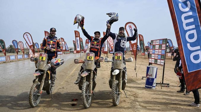 Kevin Bevanides, Toby Price et Skyler Howes… le podium moto de la 45ème édition du Dakar. Deux KTM et une Husqvarna au devant de la scène et une course à couper le souffle ! 43 secondes, l’épaisseur d’une paille ! La folie d’une course ! Cette course sur deux roues, durant 14 étapes, fut époustouflante, que dirais-je, merveilleuse et palpitante.