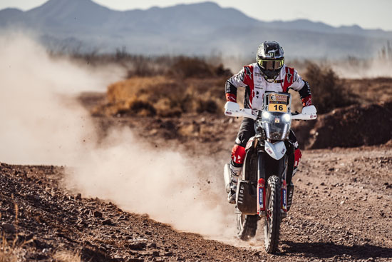 Team rider Ross Branch brought his Hero 450 Rally home in the 5th fastest time of the day. His team mate Sebastian Buhler completed the Stage in the 13th position amongst Rally GP class riders.