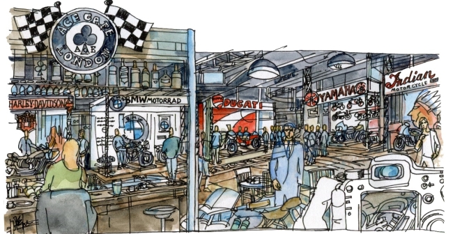 Mais ce n’est pas tout, un acteur incontournable de la culture motocycliste anglo-saxonne sera la figure de proue de cet espace : Ace Café. Véritable lieu d’échange, de passion et de convivialité, le célèbre restaurant-bar délocalisera pour l’occasion à Paris son ambiance inimitable, sa carte, son bar, ses Juke-Box et sa boutique officielle. Mike Wilsmore, le gérant et figure iconique de cette institution londonienne, viendra également à la rencontre des visiteurs du salon pour leur conter des histoires et répondre à leurs questions autour d’une tasse de thé !