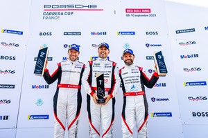 Le dimanche, Marvin Klein profitait comme la veille de sa pole position pour prendre le meilleur envol et dominer la course de bout en bout en distançant régulièrement ses poursuivants. Incisif à l’extinction des feux, Alessandro Ghiretti délogeait de son côté Louis Perrot de la deuxième place avant de se montrer pressant sur Klein. Deuxième au passage du drapeau à damiers, le pilote Martinet by Alméras n’en marquait pas moins des points importants en vue de la lutte pour le titre qui s’annonce une nouvelle fois particulièrement serrée en fin de saison. Avec une belle pointe de vitesse affichée tout au long du week-end, Louis Perrot, l’ancien Simracer, pouvait enfin savourer la joie d’un premier podium en Porsche Carrera Cup France.