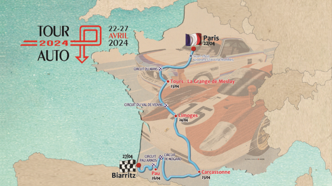 Comme le veut la tradition, l’édition 2024 du Tour Auto commencera le lundi 22 avril par une exposition des voitures à Paris. Le lendemain (mardi 23 avril) les concurrents quitteront la capitale dès les premières heures de la matinée pour rejoindre l’Autodrome UTAC Linas-Montlhéry où sera donné le départ officiel dans le cadre du Centenaire de l’Autodrome, avec une épreuve spéciale dès le début du rallye. Puis, ils se lanceront sur les routes de France et se mesureront lors d’épreuves chronométrées (Compétition ou Régularité) sur quatre circuits (Bugatti-Le Mans, Val de Vienne, Nogaro, Pau-Arnos) et une dizaine d’épreuves spéciales disputées sur routes fermées. Le parcours du Tour Auto, chaque année renouvelé, passera par Tours-La Grange de Meslay, Limoges, Carcassonne, Pau et Biarritz où les concurrents seront attendus samedi soir. L’itinéraire détaillé, avec les horaires de passage dans les communes, sera communiqué prochainement.