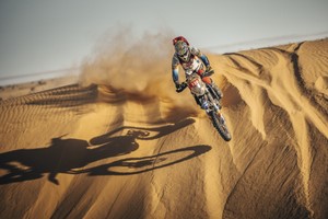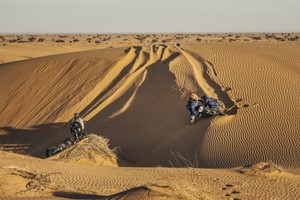 Une fois encore, dans la catégorie moto, les trois premiers pilotes du classement général ont franchi la ligne d’arrivée ensemble. Parti premier ce matin de Chami, Alessandro Botturi a chuté une première fois dans le petit cordon de dunes situé après 10 km. Le temps de remettre sa Yamaha Ténéré 700 sur ses roues, l’Italien a vu revenir sur lui l’Aprilia 660 Tuareg de son compatriote Jacopo Cerutti qui s’était élancé 2 minutes derrière. Les deux hommes ont ensuite fait route ensemble. Ils ont même chuté exactement en même temps, pour le plus grand plaisir des photographes présents qui ont immortalisé ces deux saltos avant parfaitement coordonnés.
