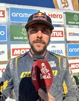 « J’ai cassé une grosse pièce du châssis après 300 km, ce qui m’a contraint à m’arrêter pour réparer, mais cela reste malgré une bonne journée puisque je gagne l’étape. Ça a quand même été difficile car je me suis retrouvé dans la poussière des autos après mon arrêt réparation. Je suis content du résultat. »