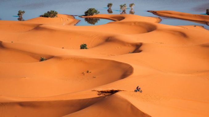 The route of the longest day of this year’s Rallye du Maroc headed out of Zagora into the Oriental region but unlike the previous stages, the rain had not made as much of an impact on the route. 327km of timed special awaited the competitors as the stage made its way north via the breathtaking Merzouga and Erg Chebbi dunes, which rise over 500 feet at their peak. It was going to be as spectacular to ride as they were to see, especially as the recent rainfall had created glimmering lakes that nestled in amongst the dunes. With half of the stage made up of stony tracks caution was still advised as riders headed to the final destination of Mengoub Bouârfa.