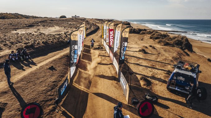 La caravane de l’Africa Eco Race 2025 a débarqué à Tanger ce 31 décembre à l’aube. Après un accueil chaleureux par les équipes de Tanger Med et un copieux petit déjeuner traditionnel marocain, les concurrents se sont élancés dans la première étape vers Tarda. Un parcours de 755 kilomètres pour cette longue journée, comprenant une première spéciale de 47km. Un secteur chronométré inédit et très sablonneux dans son intégralité, longeant la mer dans les dunes côtières. Malgré son faible kilométrage, cette spéciale fut éprouvante avec des subtilités de navigation et un sable particulièrement mou. En moto, l’italien Jacopo Cerutti s’impose sur Aprilia. Le vainqueur de la précédente édition devance Alessandro Botturi et Pol Tarres, tous deux sur Yamaha. Sur 4 roues, Pierre Lafay prend la première place en Can-Am Maverick, devant Magdalena Zajac et son Toyota Hilux. Vincent Vroninks et son Red-Lined VK56 décroche la troisième place. En camion, l’équipage hollandais mené par Will Van Groningen sur Iveco devance le Man de leurs compatriotes pilotés par Gerrit Zuurmond.