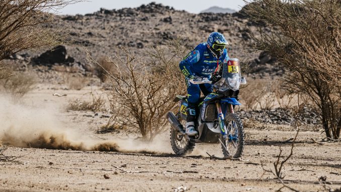 Lorenzo Santolino a été légèrement gêné par la poussière d’un concurrent qu’il a dû suivre plusieurs kilomètres dans un canyon avant de pouvoir le dépasser. « Je suis assez satisfait de la navigation. Il y avait beaucoup de flèches, mais j’ai suivi le roadbook et j’ai réussi à anticiper certaines trajectoires. Je me sentais à l’aise, mais j’ai rattrapé Balossi vers le kilomètre 15, dans un canyon avec beaucoup de poussière. J’ai dû attendre un peu avant de pouvoir le dépasser, jusqu’à ce que le terrain s’ouvre. J’ai perdu un peu de temps, mais l’essentiel, c’est le rythme et les sensations. Je suis content de la moto, des sensations de pilotage et de ma condition physique. »
