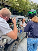 « Nous avons eu droit à un super finish avec une cortège de 40 e-cyclistes qui nous ont accompagnés jusqu’au lieu de la cérémonie d’arrivée où nous attendaient Philippe Citroën, le 1er adjoint de la Mairie de Capetown, l’Ambassadeur de France, des journalistes et de nombreux invités !