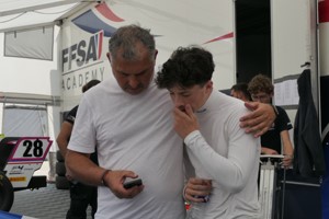 Le temps tournait à l’orage le samedi après-midi, entraînant la sortie des pneumatiques pluie. Après l’abandon de Munoz dans la course précédente, un nouveau rebondissement survenait avec les sorties de Jules Roussel et de l’Allemand Sacha Maassen sous les trombes d’eau du premier tour. La course était interrompue de longues minutes, après la mise en parc fermé des monoplaces. Le nouveau départ permettait à Rafaël Perard de profiter de sa pole position (selon le principe de la grille inversée pour les 10 premiers de la séance de qualification) pour emmener l’imposant peloton de 30 voitures de la FFSA Academy. Mais la situation allait très vite évoluer dans cette course passionnante. Le Japonais Rintaro Sato s’installait au commandement, avant de le céder cinq tours plus tard à Guillaume Bouzar. Parti 5è, ce dernier confirmait rapidement sa supériorité dans ce contexte très humide en réalisant le meilleur tour en course et en creusant l’écart sur ses adversaires.