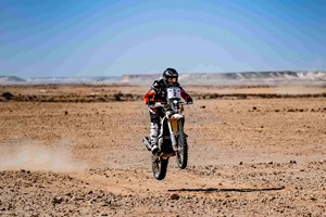Dabrowski was the class of the bike field from the outset. The KTM rider started 10th on the road, overtook all his rivals and finished the stage 20min 13.6sec in front of Germany’s Philip Horlemann. British Husqvarna rider Alex McInnes moved up to second overall with Horlemann in third.