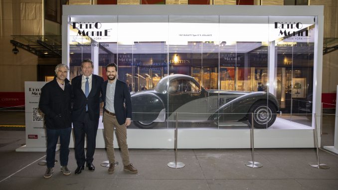 Rétromobile New York a lancé le compte à rebours de son premier événement dédié aux voitures classiques, prévu du 19 au 22 novembre 2026, en dévoilant un modèle spectaculaire le 4 décembre dans les locaux de Christie’s à Rockefeller Plaza. Dans une vitrine en verre impressionnante, se trouve une Bugatti Type 57S Atalante de 1937, l’un des 15 coupés Atalante jamais produits.