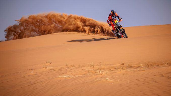 Daniel Sanders était lancé dans un récital sur la première grande étape de sable menant à Riyadh juste avant la journée de repos. Parti de Hail en 3 position, le tenant du titre a enfumé sur sa route Nacho Cornejo puis son coéquipier Luciano Benivades pour terminer la spéciale en solo et gloutonner une belle portion des bonifs dédiées à l’ouvreur (2’40), de quoi prendre le large au classement général. Mais l’Australien, probablement porté par son enthousiasme, a négligé une zone à vitesse limitée, une sottise qui lui vaudra une pénalité de six minutes.