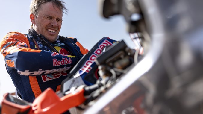 Sanders led the Dakars bike race when he crashed heavily on yesterday’s Stage 10. This morning when the Australian started Stage 11 his priorities had shifted. It’s not about winning back-to-back titles any more, just reaching the end of the rally will be an enormous achievement worthy of Dakar folklore. Chucky gritted his teeth and powered through the 347km special stage as well as over 500km of liaison route between Bisha and Al Henakiyah.