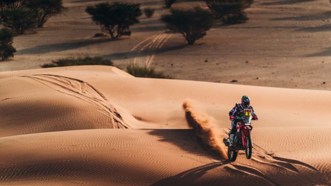 After losing his overall lead, Preston Campbell took a reflective approach yesterday, fully aware of the challenge ahead. On the 331 km special stage from Al Henakiyah to Yanbu today, he rode his Honda CRF450RX RALLY with confidence, powering through rocky sections before tackling the dunes. Another podium finish saw him in third place, five and a half minutes behind stage winner Michael Docherty. However, his main rival, Toni Mulec, finished nearly four minutes ahead, stretching the overall gap to 6’12”.