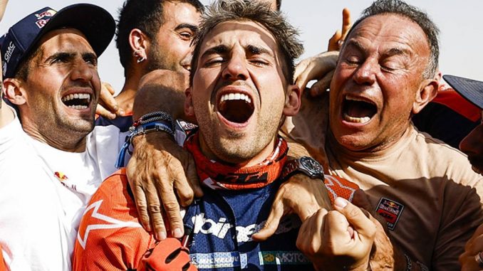 La dernière étape du Dakar 2026 a donné lieu à un scénario inouï, à ranger dans l’histoire du sport mondial aux côtés du final du Tour de France 1989 (1.LeMond > 8 » > 2.Fignon) ou des prolongations de la finale de l’Euro 2000 remportée par la France face à l’Italie (2-1). Chez les motards, Luciano Benavides a battu Ricky Brabec avec un écart record de 2 », au terme du retournement de situation le plus tardif qu’ait connu le Dakar, sur une erreur de navigation commise à moins de 7 kilomètres de l’arrivée. La joie est totale dans le clan Red Bull KTM Factory Racing, tandis que le pilote américain de Monster Energy Honda HRC, qui passe à côté d’un triplé, encaisse sa défaite avec amertume et dignité. Le pilote argentin gagne la première course de sa carrière et rejoint au palmarès son frère Kévin, gagnant du Dakar en 2021 et 2023.