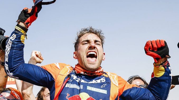 Après les déboires de Sanders, c’est tout le poids de l’équipe KTM qui pesait sur les épaules de l’Argentin, avec la responsabilité de partir au combat face à Brabec, déjà vainqueur à deux reprises (2020-2024) et manifestement toujours en cannes. En plus de son pilotage au cordeau, l’Américain tentait un coup de poker, voire un coup de génie en freinant dans le final de l’étape 11 pour laisser Luciano prendre la première place, mais avec seulement 23 » d’avance et dans la pire position pour attaquer la 12è étape : un piège mathématique imparable, accompagné d’un coup de massue psychologique pour un leader en sursis, présentant ce soir-là une mine bien triste. Le scénario concocté dans le cerveau US prenait bien forme puisque pour la dernière étape, souvent regardée comme une formalité, Brabec s’élançait avec 3’43 d’avance. L’affaire était même emballée… jusqu’au km 98,4 ! Ouvrant la piste, le pilote Honda n’a plus qu’à parader pendant 7 kilomètres, mais commet une erreur de navigation qui l’envoie légèrement trop à gauche, l’oblige à une boucle d’environ trois kilomètres pour retrouver la bonne piste. Pendant ce temps, Luciano Benavides déboule sur la ligne d’arrivée, et voit Ricky Brabec pointer deux secondes trop tard, soit l’écart le plus faible jamais observé sur un classement général du Dakar. Un délire ! Encore plus fort que son double-vainqueur de frère Kevin, qui avait lui aussi renversé le classement général le dernier jour en 2023, gagnant avec 43 » d’avance sur Toby Price.