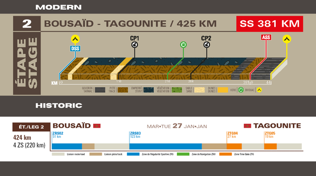 Le rallye rentre dans le vif du sujet, les portes du désert s’ouvre en grand aux concurrents après une première étape neutralisée en raison des conditions météos. 44km de liaison et 381km en spéciale voilà de quoi mettre en jambe le plateau familial de cette édition.