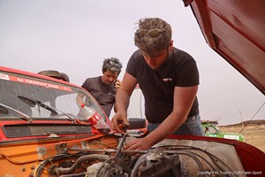 12h00 : Coup dur pour les #499 sous la 4L. Sur le plateau de Mharech, leur plaque sous moteur se dévisse en pleine piste.